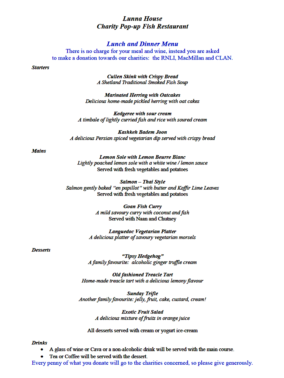LUNNA House is hosting a charity lunch and dinner next Sunday (15 Nov) in aid of the RNLI, MacMillan nurses and Clan Cancer Support.